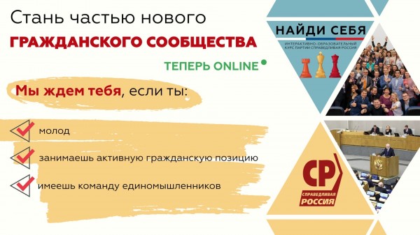 Политическая партия СПРАВЕДЛИВАЯ РОССИЯ проводит образовательный онлайн курс "Найди себя: стань частью нового гражданского сообщества". Обучающая программа научит молодых людей ориентироваться в общественно-политическом пространстве. Слушатели познакомятся с особенностями законодательной, исполнительной и общественной деятельности, определят свои сильные и слабые стороны в каждом из этих направлений. Участником курса могут стать молодые люди: в возрасте от 18 до 30 лет занимающие активную гражданскую позицию имеющие команду единомышленников (от 5 человек) Регистрация на курс открыта до 15 апреля. Чтобы стать участником, необходимо: 1. Сделать репост записи: https://vk.com/srgdzio?w=wall-177245955_107 2. Заполнить онлайн анкету:https://docs.google.com/forms/d/e/1FAIpQLSfzkL-5vdXRgw3cL3_mUld3LQBskzryHGy5x_8zjKa2m5y1mQ/viewform 3. Успешно пройти отбор. ![]() |